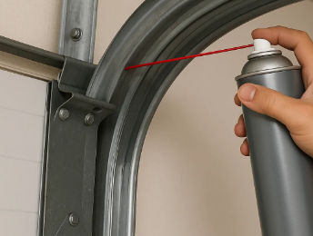 Spray a light coating of your garage door track lubricant along the top and outer edges of the metal tracks. Make sure not to spray directly on the inside surface where the rollers move — that area should stay dry to prevent buildup and slipped rollers.